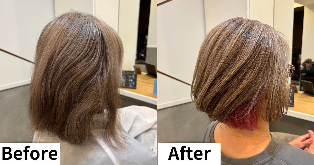 白髪率が高いので明るめカラーで白髪は目立たないようになりましたが、マンネリ化していたのでインナーカラーでデザインを楽しみたいとご希望でした。