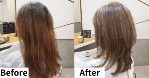 - その後シャンプーします。同時に頭皮のデトックスマッサージを行いながら色持ちが格段に良くなる特別な処理をします。最後に髪に最高の質感をもたらしてくれる美髪トリートメントをします。