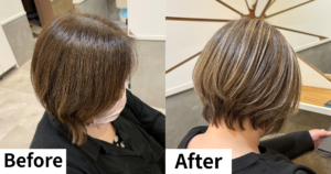 - 最後の調整カットをして見た目年齢マイナス10歳のスタイルの完成です。